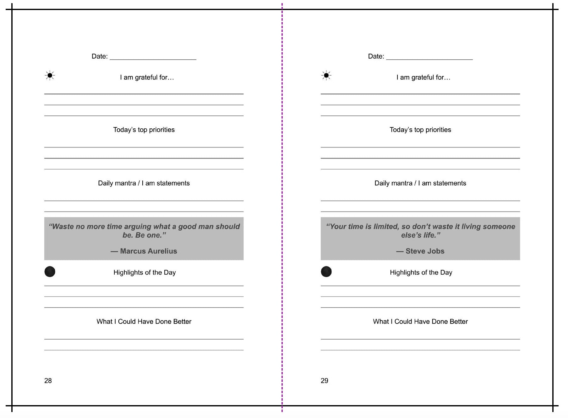 - Daily gratitude, affirmations, and top priorities