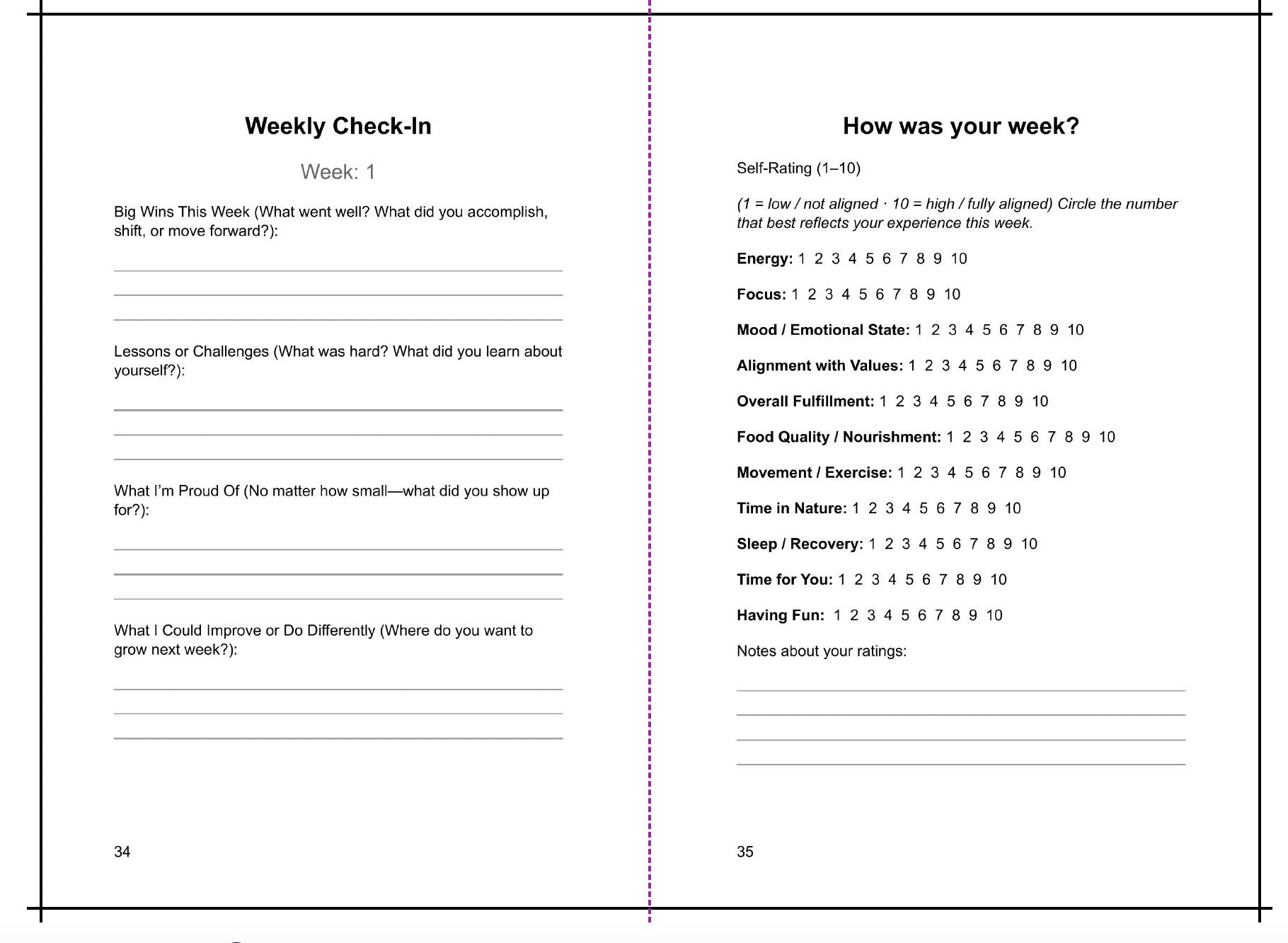 - Weekly check-ins across 11 core life categories to track growth, energy, and alignment